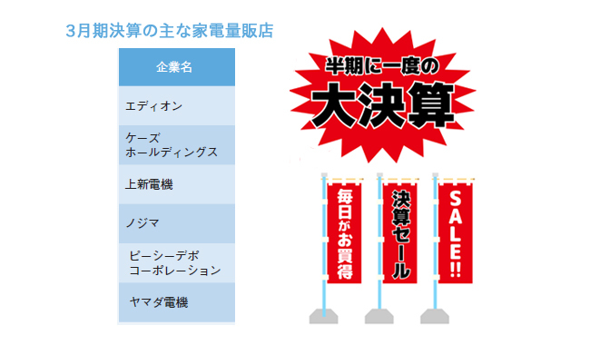 3月に決算期を迎える小売店は多い。大手家電量販店に限ると、エディオン、ケーズデンキ、上新電機、ノジマ、ヤマダ電機、PC専門店のPCデポなどだ。残り2週間、これらのリアル店舗では大幅な値引きが期待できる。