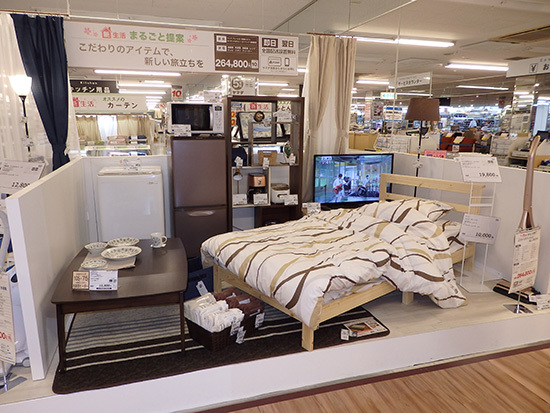 例えば、「梅」は12万9800円で冷蔵庫、洗濯機、炊飯器、レンジ、テレビ、こたつ、クリーナーの家電製品のほかベッド、布団・カバー、マットレス、カーペット、カーテン4点、収納家具をセットにしている。収納棚に飾ってあるスタンドやかご、タオル、スリッパもすべて同店で取り扱っている。
