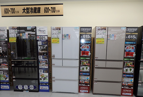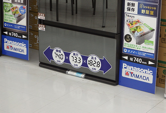 同じようなコンセプトは、冷蔵庫やエアコンの売り場でも顕著だ。冷蔵庫の扉に張るものはプライスカードなど最小限にとどめて、メーカーPOPは本体の間に設けたスペースに展示して統一感をもたせている。逆に、自宅で設置する際に気をつけたいサイズに関する情報は大きく表示し、すべてのモデルの一番下の扉に張っている。派手にPOPを張らない演出について土井店長は「お客様が選択する際に、あるメーカーだけに偏らないように公平な基準で選べるようにしている」と明かす。