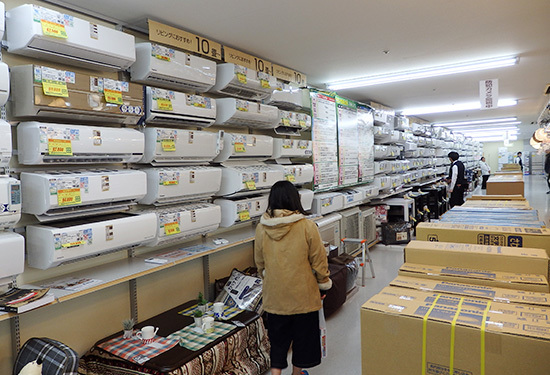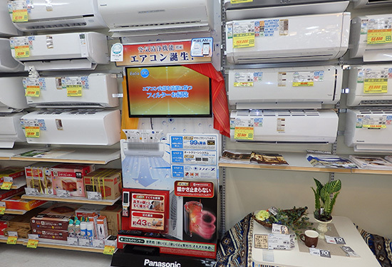 エアコン売り場も通常は1スパンを使って、メーカーが最新機種の特徴をアピールしたりするのが一般的だが、横浜金沢店でそれをするのはパナソニックだけで、それ以外はエアコンが壁面の奥まで整然と並んでいる。