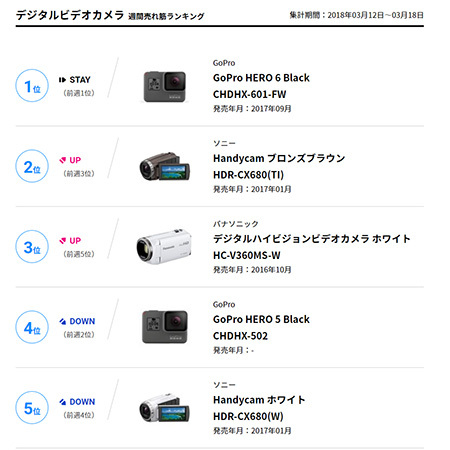 2018年3月12日~3月18日のデジタルビデオカメラ販売台数ランキング(1位~5位)