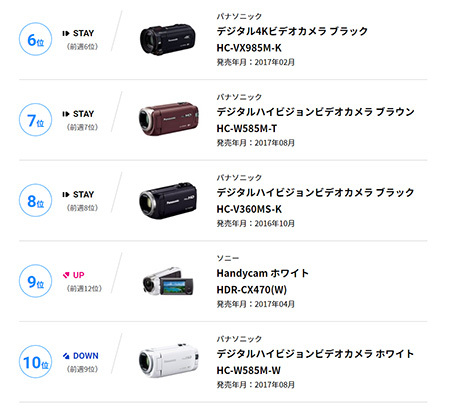 2018年3月12日~3月18日のデジタルビデオカメラ販売台数ランキング(6位~10位)