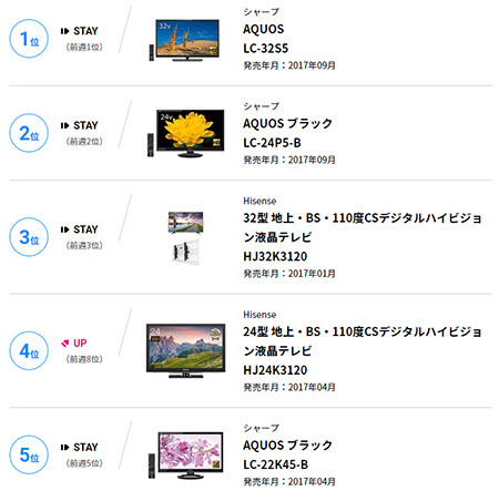 「週間売れ筋ランキング」は、カラーバリエーションなどを別々に集計した機種別の販売台数ランキング。1位~6位までは20型~30型台が占めており、新生活シーズンに向けて小型テレビが人気になっている。とりわけ、Hisenseが17年4月に発売した24型液晶テレビ「HJ24K3120」は、前週8位から順位を上げ、4位に食い込んだ。