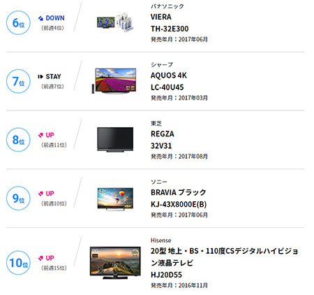 2018年3月12日~18日の薄型テレビ機種別販売台数6位~10位