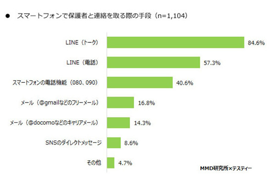 この調査で、スマホで保護者と連絡を取る際の手段について聞いたところ(複数回答可)、「LINE(トーク)」が84.6%と最も多かったという。次いで、「LINE(電話)」が57.3%、「電話機能(080、090)」が40.6%となり、LINEでのやりとりが上位を占める結果となった。また、家庭にある端末では「固定電話」が74.1%が最も多い一方、固定電話が自宅にない所有していない中高生のうち、23.8%が「固定電話を使ったことがない」と回答したとのことだ。