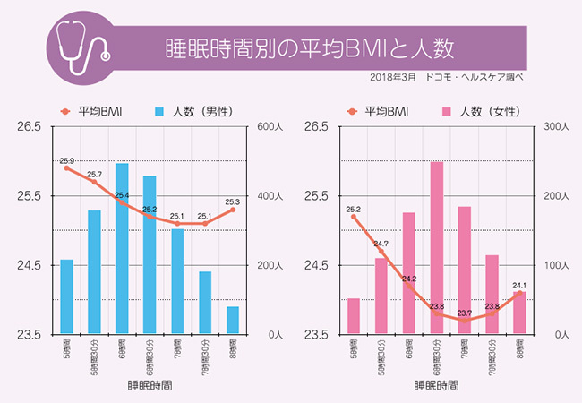睡眠時間と、体重と身長の関係から算出される人間の肥満度を表す体格指数「BMI値(ボディマス指数)」の関係を分析したところ、睡眠時間が男性で「7時間」もしくは「7時間30分」、女性で「7時間」が最もBMI値が低いという。一方、睡眠時間別に人数を確認すると、男性は「6時間」が多く、女性は「6時間30分」が多い。痩せやすい睡眠をとるためには、男性がプラス1時間、女性がプラス30分の睡眠時間を意識的に確保するといいとのことだ。なお、監修は睡眠専門医の遠藤拓郎先生。