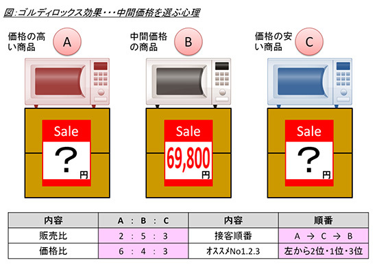 ゴルディロックスとは、イギリス童話の「3匹の熊」に出てくる少女の名前で、物語ではお粥や椅子、ベッドを選んだ際、ちょうどいい「温かさ」「大きさ」「柔らかさ」を選んだことから、中間値(中間価格)が選択されやすい心理効果に付けられた名称である。家電量販店では「おすすめベスト3」として、多くの店舗で実施されている一般的手法だが、価格差の選択は経験則によることが多いため、効果を最大限に高めるためにゴルディロック効果を用いるといいだろう。