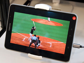 タブレット端末はサムスン電子製。同社製の5Gモデムを内蔵しており、最大で約3Gbpsの高速通信が可能。2月の平昌五輪で韓国の通信事業者・KTが実施した5G試験サービスにおいて、サムスンは5G対応タブレット端末を提供していたが、今回KDDIが公開した端末はそれと同等機種だという。これまで国内で公開された5G通信実験では大型の試験用機器が端末として使われており、5G対応のタブレット端末が一般公開されるのは初。