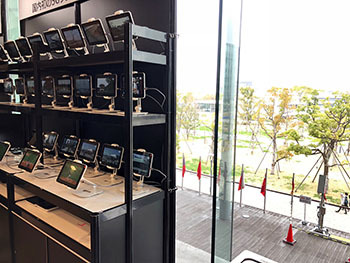 5G対応のタブレット端末(左)と基地局