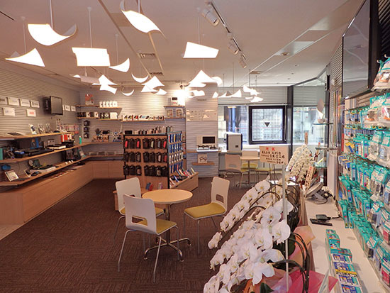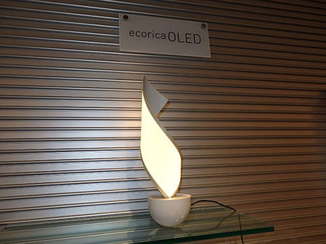 有機EL照明は、薄い形状で曲げられるためデザインの自由度が高い。エコリカのショールームの天井に設置された照明も、鳥が羽ばたいているような躍動感のある空間を演出している。また、発光効率が高く、スマートフォンやテレビのディスプレイでの採用も広がっている。
