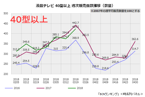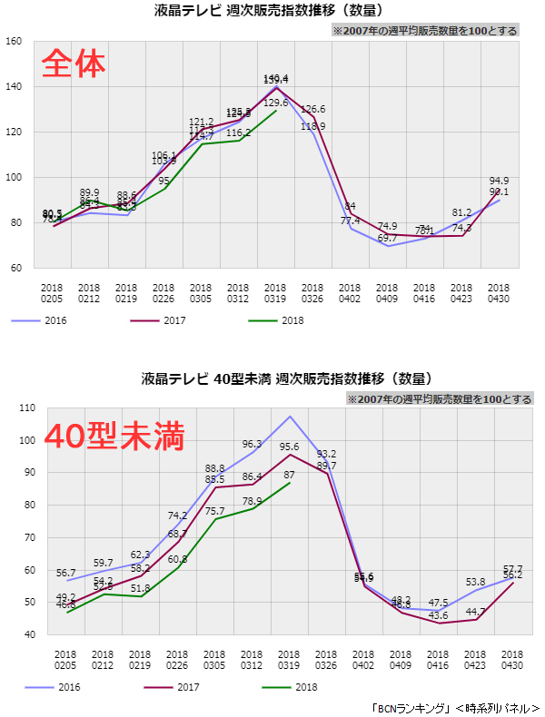 2月から4月上旬までの春商戦で、例年、最も販売台数が跳ね上がるピークの時期は、祝日が通常より1日多い3月第3週。今年の場合、3月19日~25日にあたる。「BCNランキング」をもとに、過去3年間の3月第3週の販売台数指数(2007年の同カテゴリの週平均販売数量を「100」とした指数)をみると、18年は「129.6」、17年は「139.4」、16年は「140.9」だった。40型未満に限ると、18年は「87.0」にとどまり、3年前との落差はより大きい。