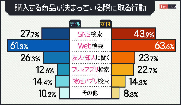 「購入する商品が決まっている際に取る行動」をたずねると、男女ともに「Web検索」がもっとも多かった。男女とも2位は「SNS検索」だったが、男性27.7%に対し、女性は43.9%と、15ポイント以上も開きがあった。