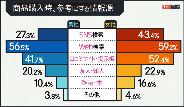「商品購入時、参考にする情報源」でも、「Web検索」が男女とも約6割で1位となり、「口コミ、掲示板」「SNS検索」と続く。