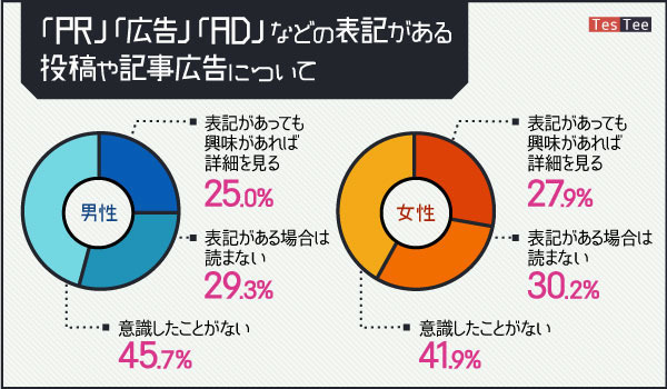 「PR」「広告」「AD」といった表記については、6割以上がその意味を知っている、もしくはなんとなく他の投稿とは違うと感じており、男性の25.0%、女性の27.9%が「表記があっても興味があれば詳細を見る」と回答する一方、「表記がある場合は読まない」という回答も3割程度を占めた。