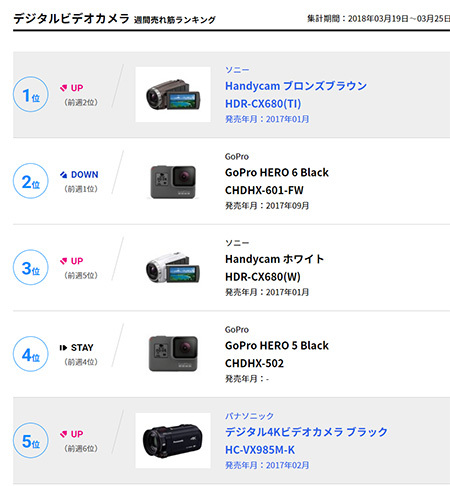 3月19~25日のデジタルビデオカメラ販売台数ランキング(1~5位)