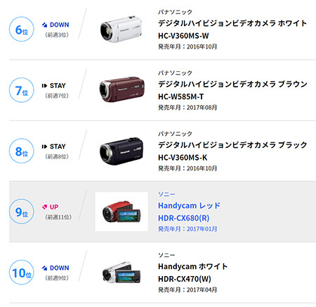 6位から10位までで目立ったのは、パナソニックのデジタルハイビジョンビデオカメラでカラーがブラックの「HC-V360MS-K」。前週6位から5位にアップしている。また、ソニーのHDR-CX680でカラーがレッドの型番「R」が前週11位から9位にランクイン。これによって、HDR-CX680は全カラーがトップ10以内に入ったことになる。