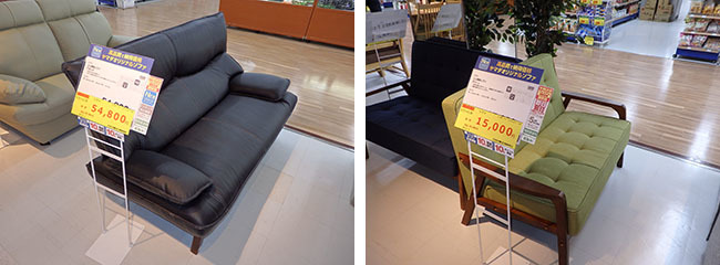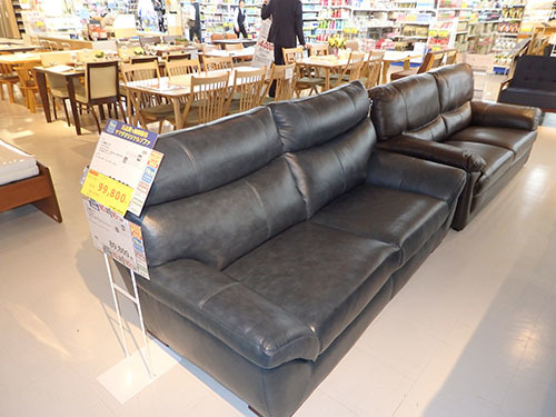 オリジナルソファは高級感のある3人用革ソファがオープンセールで税別9万9800円、背もたれが外れて白ステッチのデザインをあしらったミドルクラスの2人用革ソファが5万4800円、天然木のフレームと掃除機をかけやすく脚を高くした普及タイプの2人用布ソファが1万5000円と、3タイプのラインアップで販売している。