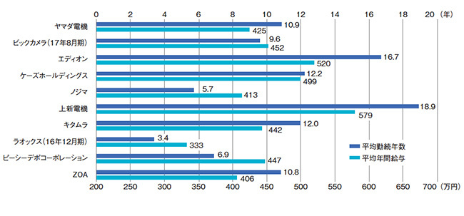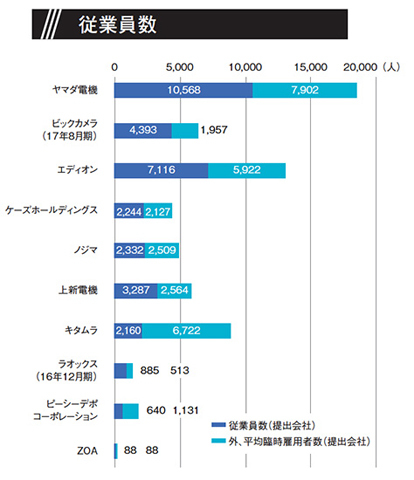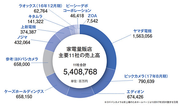 売上高が7兆円を超えるとされる、巨大な国内家電市場の全体像を把握するため、各社の売上高や従業員数などをまとめてみる。もとになるデータは上場している家電量販店の主要10社が2017年に提出した有価証券報告書(17年3月期)。業界の最新動向とあわせて、各社の状況を読み解く。(BCN・南雲 亮平)