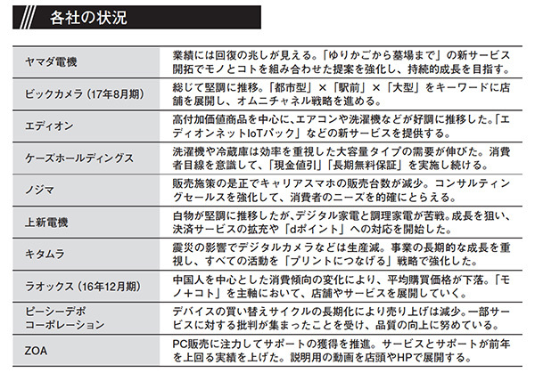 11社の売上高の合計は、前年より約45億少ない、5兆4087億6800万円だった。1位はヤマダ電機、2位はビックカメラ、3位はエディオン、4位はケーズホールディングスで、非上場のヨドバシカメラが続く。力を入れる分野、伸びている分野は、各社それぞれだ。