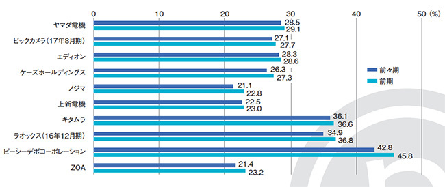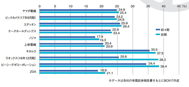 粗利率とも呼ばれ、仕入れた商品にどれだけの利益をのせているかを示す。PCデポのグラフが伸びているのは、サービス事業を主軸に置いているから。ZOAの前々期を上回る実績からは、施策が奏功している様子がうかがえる。