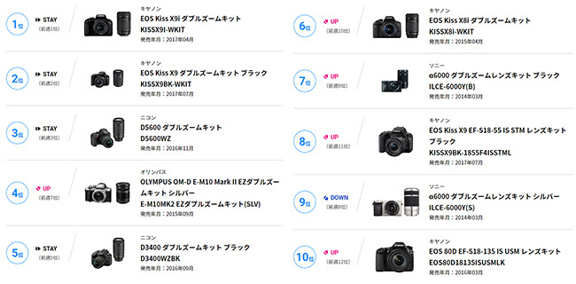 家電量販店・オンラインショップの実売データを集計した「BCNランキング」によると、2018年3月19~25日におけるデジタル一眼カメラの機種別販売台数(PB製品を除く)ランキングで、キヤノンとソニーそれぞれの新製品が大きく順位を上げたことがわかった。