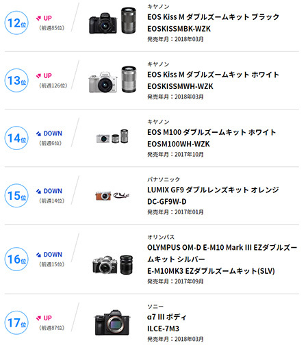 10位以外の上位グループは定番のモデルが占めている一方、キヤノンが18年3月に発売した「EOS Kiss M ダブルズームキット ブラック(EOSKISSMBK-WZK)」は前週85位から12位へ、同モデルのホワイトが前週126位から13位に急上昇。ソニーが18年3月に発売した「α7 III ボディ(ILCE-7M3)」は、前週87位から17位に順位をあげた。行楽・行事が続く春には、高性能で誰でも使いやすいミラーレス一眼が注目を集めているようだ。