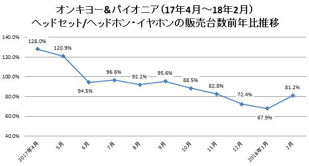 家電量販店・オンラインショップの実売データを集計した「BCNランキング」によると、オンキヨー&パイオニアのヘッドセット・ヘッドホン・イヤホンの販売台数は9か月連続で前年を下回り続けている。最低を記録したのは18年1月で、前年同月比67.9%の落ち込みだった。
