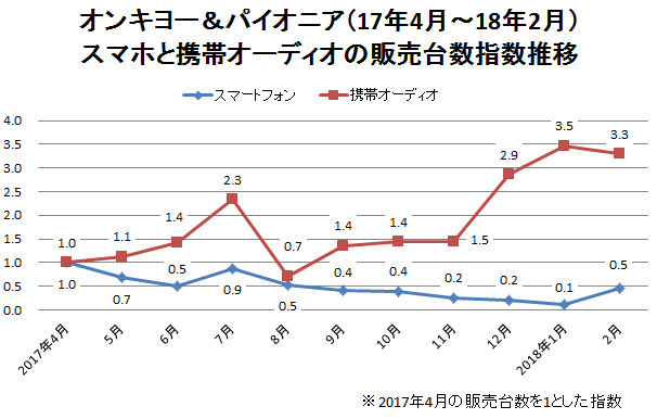 また、オンキヨー&パイオニアのデジタルオーディオプレーヤーやハイレゾスマートフォンも期待通りの結果は出せていない。「BCNランキング」で同社のスマホと携帯オーディオの売れ行きを、17年4月の販売台数を1.0とした指数でみると、18年2月の時点でそれぞれ3.3と、0.5になっているが、予想には届かなかったようだ。