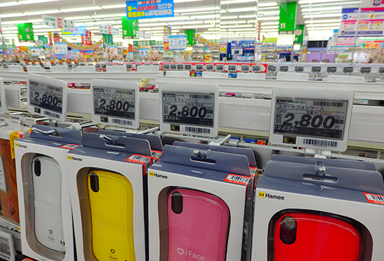 上新電機の売り場を歩けば、一目でその変化に気づく。スマートフォンケースなどの小物商品がぶら下がる棚に、液晶モニタに映し出された電子プライスカード(電子棚札)が整然と並んでいるのだ。スマホアクセサリやPC周辺機器だけでなく、ドライヤーなどの白物家電コーナーにも、同じように電子棚札が導入されている。ジョーシン西宮今津店の三島徹店長は「自社では2年前から取り組み始めて、当店でも1年前に導入した」と語る。今期(2019年3月期)中には、上新電機のほぼ全店で導入する計画だ。家電量販店のなかでは最先端の取り組みで、リテールテクノロジーの先頭を走るコンビニエンスストアでさえ、電子棚札を見かけることは少ない。