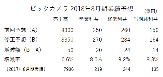 これらの結果を受けてビックカメラでは、18年8月期通期(17年9月~18年8月)の業績を上方修正した。売上高は昨年10月に発表していた予想から0.6%増となる8350億円、営業利益は8.0%増の270億円、経常利益は9.2%増の284億円、純利益は9.3%増の164億円を見込んでいる。