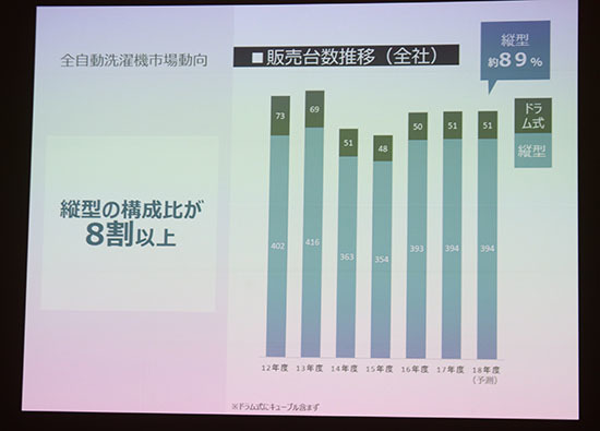 パナソニックは、6月発売予定の縦型洗濯機乾燥機の新製品「NA-FW120V1」、縦型全自動洗濯機「NA-FA120V1」の製品発表会で、洗濯機市場の最新動向を解説した。