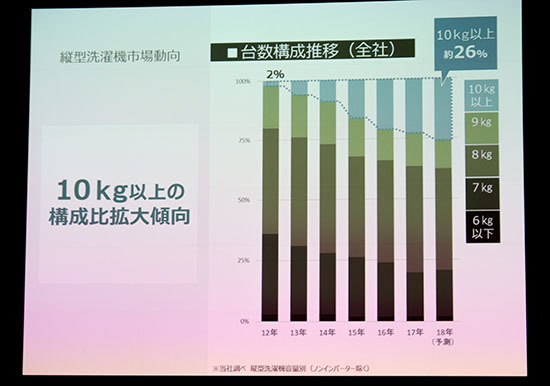 洗濯機全体の販売台数の8割以上を占める縦型洗濯機は、大容量化が進んでいる。パナソニックの調べによると、ノンインバーターを除く、全社の縦型洗濯機の容量別構成比の推移をみると、12年にはわずか2%だった「10kg以上」の台数構成比は17年には約24%に達し、18年には約26%まで上昇すると予測する。一方、「7kg」と「9kg」の比率は、年々下がりつつある。