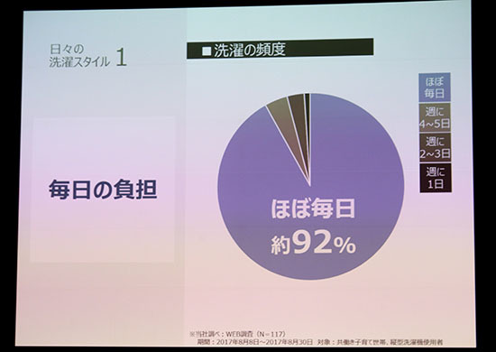 この理由について、パナソニック洗濯機マーケティング企画担当の阿部彩氏は、「縦型洗濯機を所有している共働き世帯子育て世代を対象に当社が実施したインターネット調査では、約92%が『ほぼ毎日洗濯している』と回答している。1日あたりの洗濯回数は平日でも2回以上が約45%、休日は約59%。共働き世帯の増加で、休日にまとめて洗濯する家庭が増えているため、大容量化が進んでいる」と分析する。