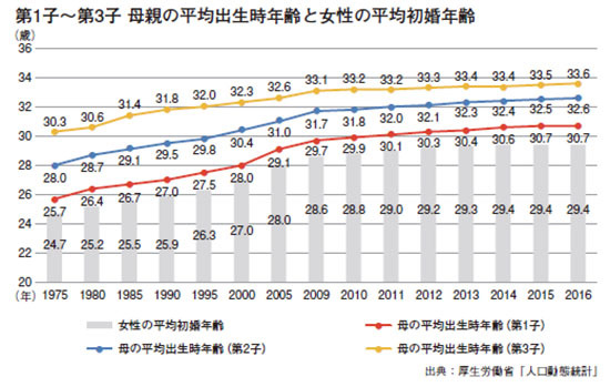 平均初婚年齢はここ30年の間で、男性はおおむね3歳、女性は4歳ほど上昇し、第1子が出生した時の平均年齢も上昇傾向が続いている。