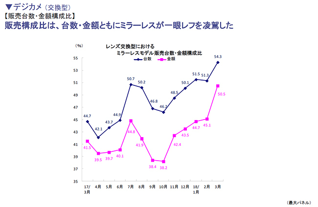 レンズ交換型では、ついにミラーレス一眼が一眼レフを販売台数、販売金額で逆転し、市場構造が激変している。18年3月のレンズ交換型におけるミラーレス一眼の販売台数構成比は54.3%、販売金額構成比は50.5%と、いずれも一眼レフを上回り過去最高となった。