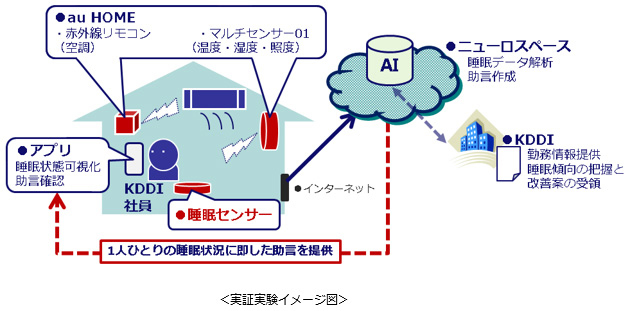 KDDIは4月16日、睡眠センシング技術と簡易評価アルゴリズムの開発を行うニューロスペースが提供する睡眠改善ソリューションを活用した実証実験を4月中旬に一部の社員を対象として実施すると発表した。