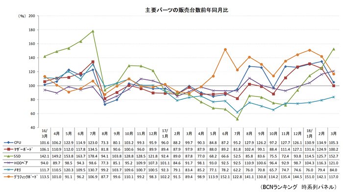 3月に入り、やや落ち着きをみせてはいるものの、CPUとマザーボードの販売台数は昨年11月から3月まで5か月連続で前年を上回り、SSDにいたっては今年1月が前年比114.5%、2月が125.7%、3月が152.7%と急増中だ。