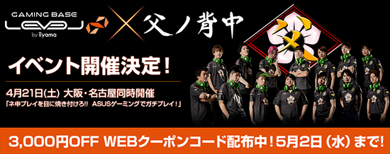 ユニットコムは、4月21日に実施するイベント「ネ申プレイを目に焼き付けろ!! ASUSゲーミングでガチプレイ!」の開催を記念して、パソコン工房のウェブサイトで「父ノ背中コラボゲーミングPC」の全機種を3000円オフで購入できるウェブクーポンコードを配布している。