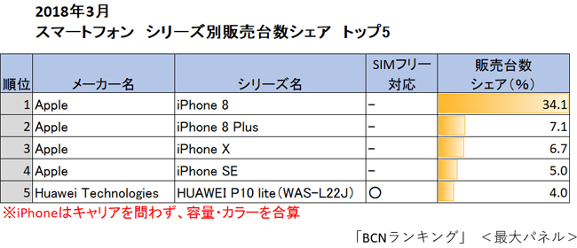 一番人気はドコモ、au、ソフトバンクが取り扱うAppleの「iPhone 8」で、スマホ全体の約3分の1、34.1%を占めた。容量別構成比は64GBが89.0%、256GBが11.0%と、大きく開いており、256GBは割高感から敬遠されているようだ。