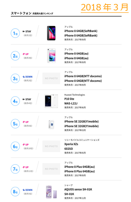 キャリア、容量ごとに別々に集計した機種別ランキングでは、3月はソフトバンクの「iPhone 8」の64GBがトップ。前月3位だったauの「iPhone 8」の64GBが2位に浮上し、2位だったドコモの「iPhone 8」の64GBは3位に後退した。