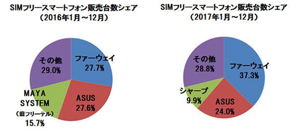 過去2年のメーカーシェアはファーウェイとASUSの2社で過半数を獲得。3位は16年のMAYA SYSTEM(旧フリーテル)、17年のシャープが10%~16%のシェアを得ているが、それ以下は複数の企業が僅差で並んでいる。