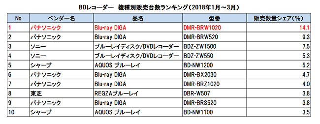 年初から好調な滑り出しだったBDレコーダー。全国の家電量販店やネットショップから実売データを集計している「BCNランキング」で機種別1位に輝いたのは、メーカー別シェアでトップを走るパナソニックの「DIGA DMR-BRW1020」だ。