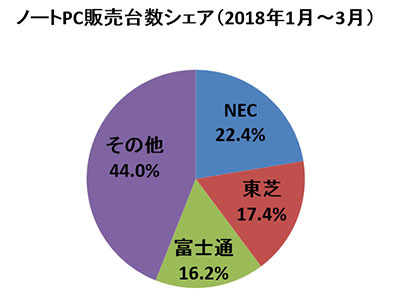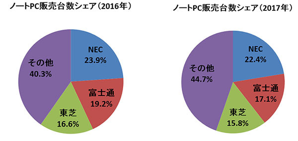 直近2年のメーカーシェアは、1位がNEC、2位が富士通、3位が東芝で並びは変わらない。17年はASUS・アップル・エイサー・デルといった海外メーカーが躍進。上位3社のシェアをじわじわと奪い、「その他」が4.4ポイント上昇している。