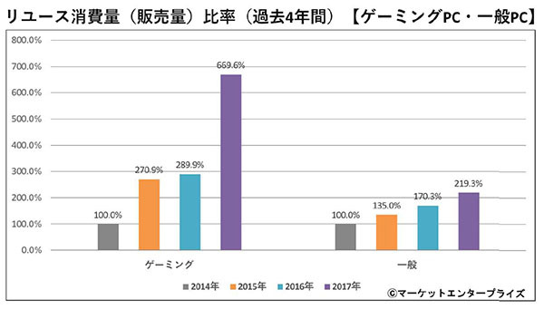 中古のゲーミングPC市場が盛り上がっている。ネット型リユース事業を手掛けるマーケットエンタープライズ(ME)のデータによると、ゲーミングPCの2017年中古消費量(販売量)は前年比約130%増と好調だった。その背景について、MEが分析結果を発表した。