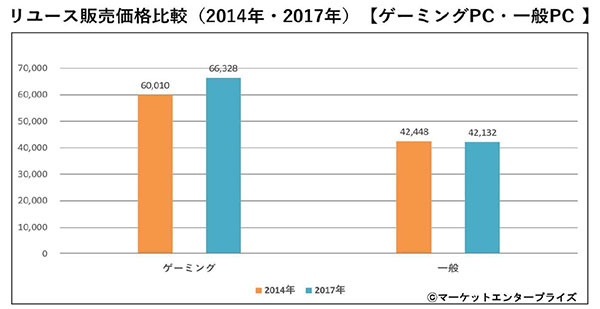 一般的な中古PC市場の成長率が前年比約30%増なのに比べると、ゲーミングPCの成長は非常に顕著だ。販売価格についても、一般PCがほぼ横ばいで推移しているのに対し、ゲーミングPCは2014年と比べて10%上昇している。この状況について、MEの高野浩志リユースエバンジェリストは、「最先端機種よりも大幅に価格を抑えられるという理由から、ライトユーザーが入門機として購入していることが要因」と解説する。