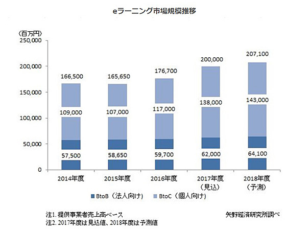 矢野経済研究所は、国内eラーニング市場について調査を実施した。2017年度の国内eラーニング市場規模は、2000億円(前年度比13.2%増)の見込みで、個人向けのBtoC市場規模が1380億円(同17.9%増)、企業・団体内個人を含む法人向けのBtoB市場規模が620億円(同3.9%増)と、両市場ともに拡大傾向にあるという。