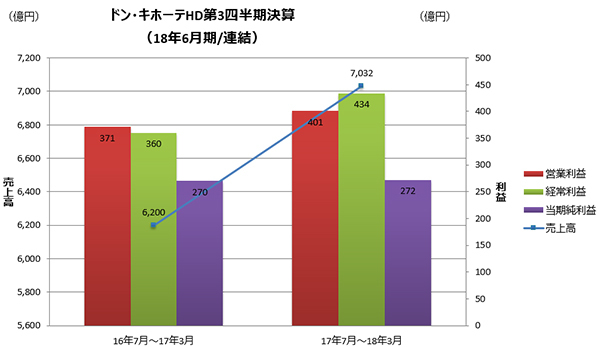 ドンキホーテホールディングス(ドンキホーテHD)は5月8日、第3四半期決算(2017年7月~18年3月)を発表した。売上高は前期比13.4%増の7032億円、営業利益は7.9%増の401億円、純利益は0.7%増の272億円でいずれも過去最高を更新した。