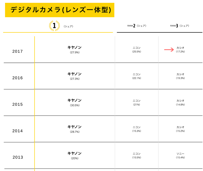 カシオは、世界で初めて1000万画素を超えたCCDを搭載したコンパクトデジカメ「EXILIM ZOOM EX-Z1000」を06年5月に発売し、トレンドに大きな一石を投じた。シェアも常に高く、家電量販店・オンラインショップの実売データを集計した「BCNランキング」によると、05~10年は、08年を除き、コンパクトデジカメのメーカー別販売台数でキヤノンに次ぐ2位。直近の14~17年もシェア10%台で3位につけていた。(BCN・嵯峨野 芙美)