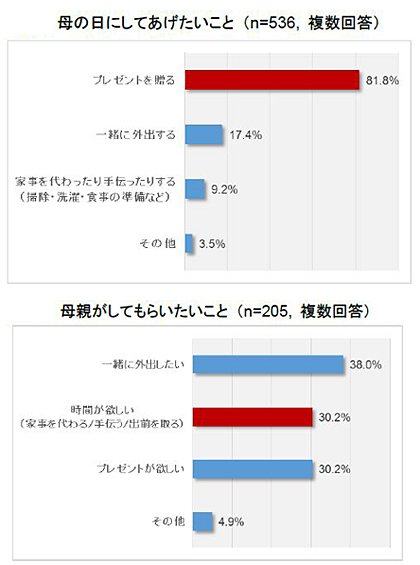 母親は思い出や時間、気持ちを求める傾向も強く、具体的にプレゼント以外に欲しいものとしては、「感謝の言葉」(39%)、「料理の準備・片付け」(27%)などが挙がった。日常生活ではそれらが足りていないと感じる人が少なくないようだ。