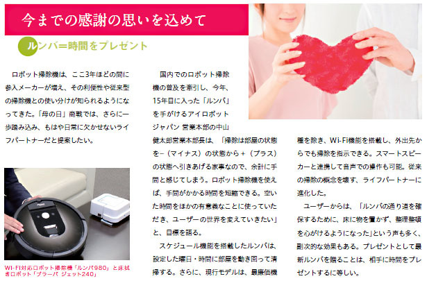 <「母の日」商戦を盛り上げるライフスタイル提案>として、編集部で各メーカーに取材した際のキーワードも「時間」だった。ロボット掃除機は、床掃除にかかる時間と身体的な負担を減らす。「時短」をウリにした調理家電は、調理につきっきりになる時間をなくす。つまり、自分自身で買う場合は「時間を買う」、相手に贈る場合は「時間をプレゼントする」ことになる。